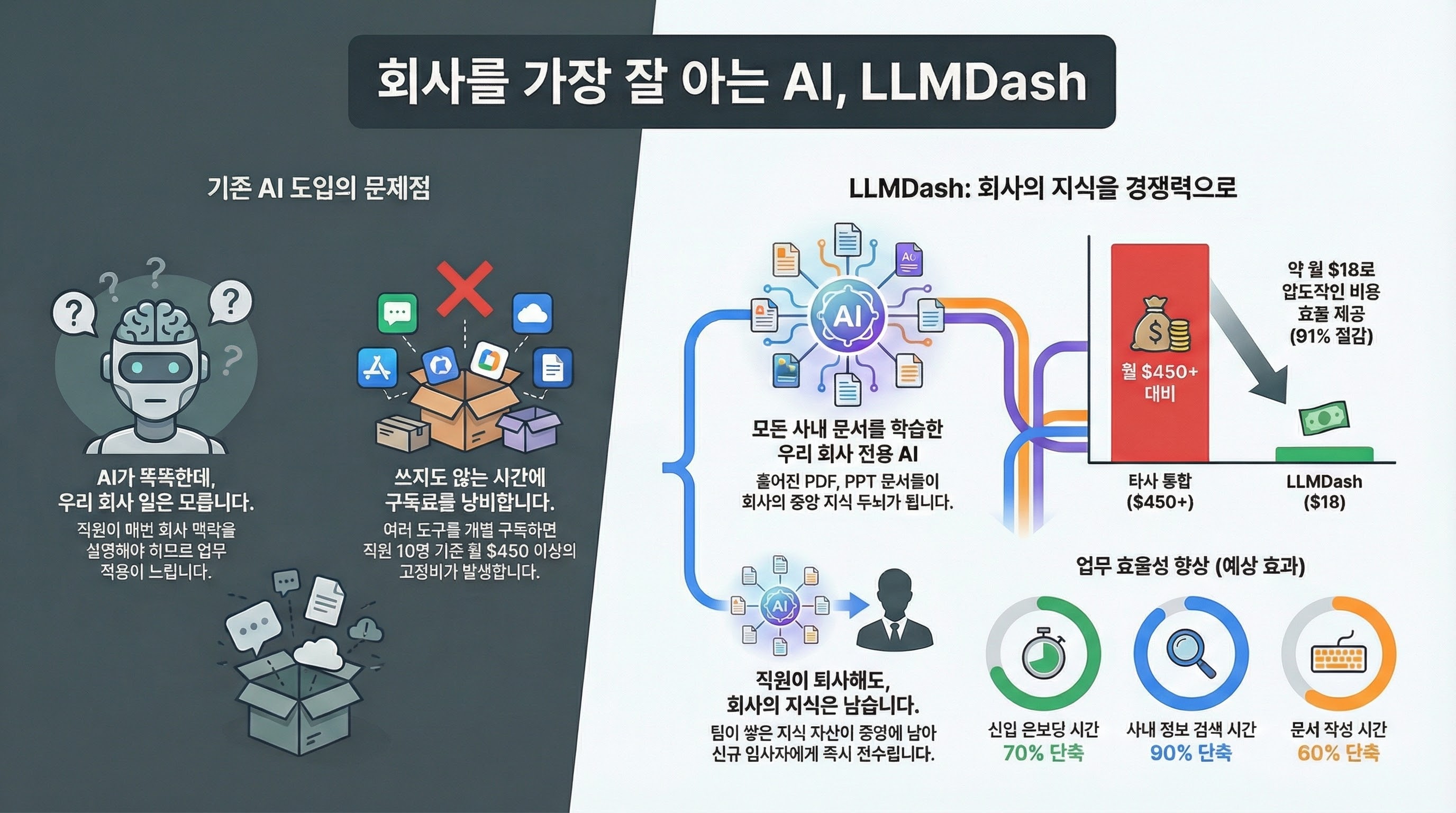 기존 AI 도입의 문제점과 LLMDash의 해결책을 한 장에 담은 요약 자료입니다. 빠른 이해와 공유에 최적화되어 있습니다.